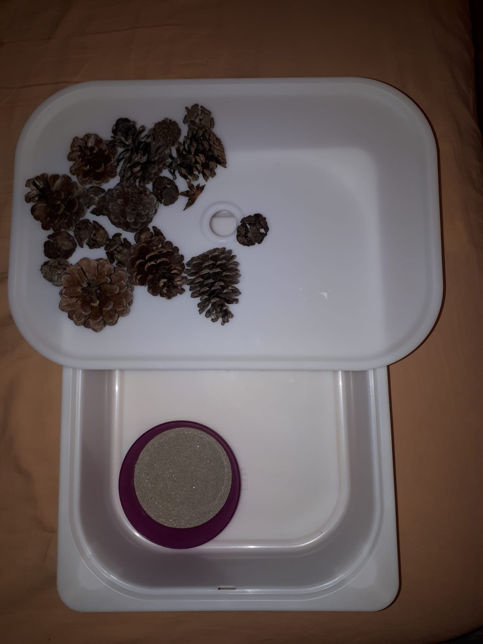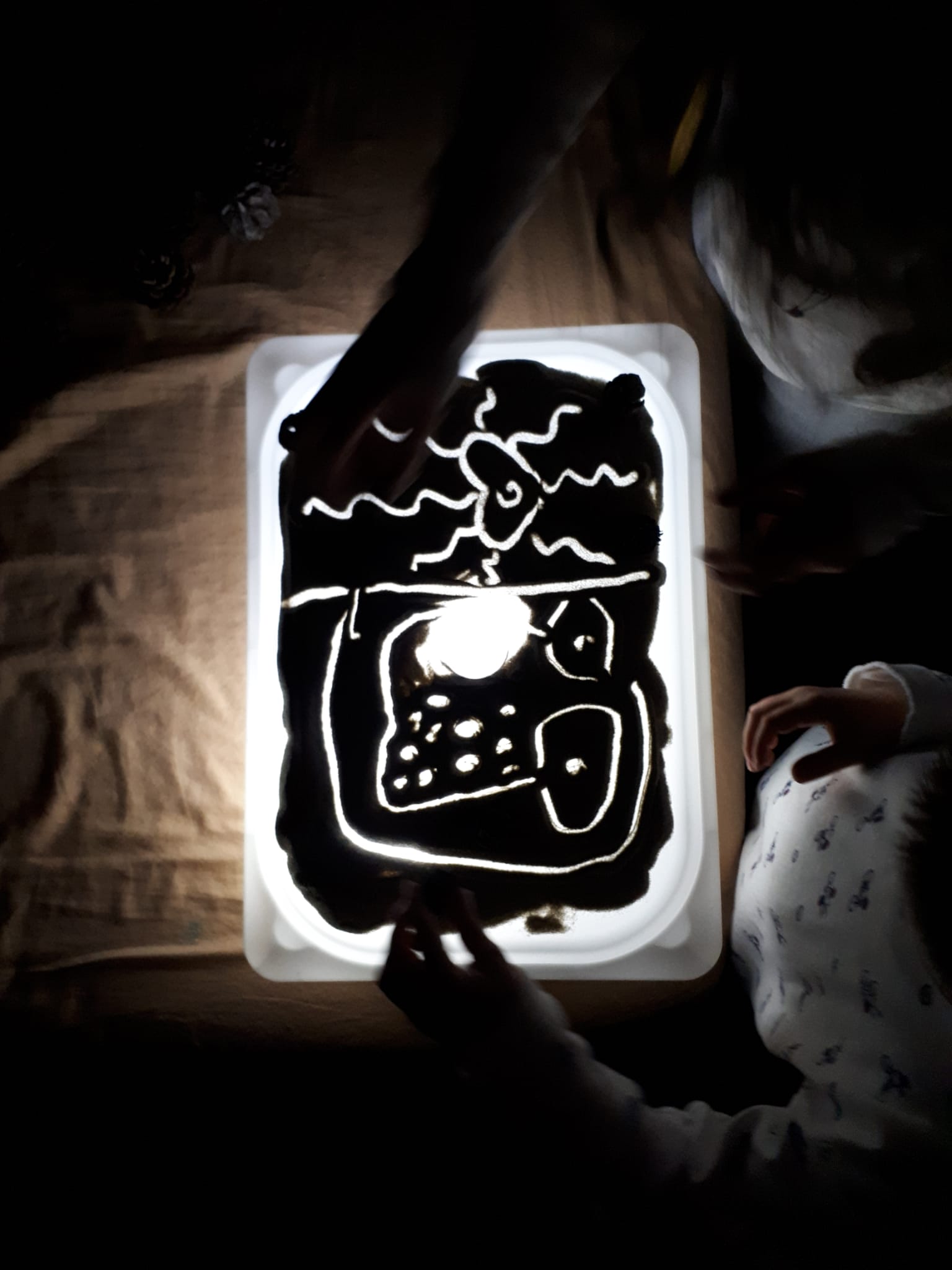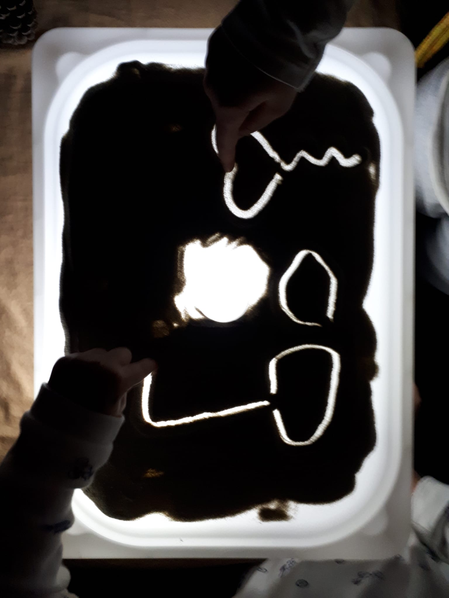Disponete la luce accesa all’interno della scatola e chiudetela con il coperchio. Sopra il coperchio versate della farina o della sabbia oppure dell’orzo e altri oggetti a vostro piacere…. E lasciatevi trasportare dalla scoperta e dalla curiosità!
