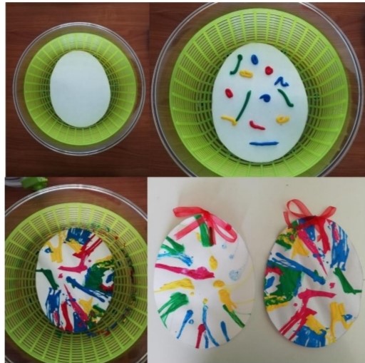 Gira, gira, gira con tuuuutta la tua forza! Se rimangono ancora degli spazi bianchi, aggiungete ancora un po’ di colore e procedete. Quando il vostro uovo verrà interamente colorato, estraetelo e fatelo asciugare. Se avete piacere, fate un piccolo buco in alto (con l’aiuto di mamma o papà) e abbellitelo con un grande fiocco colorato.
