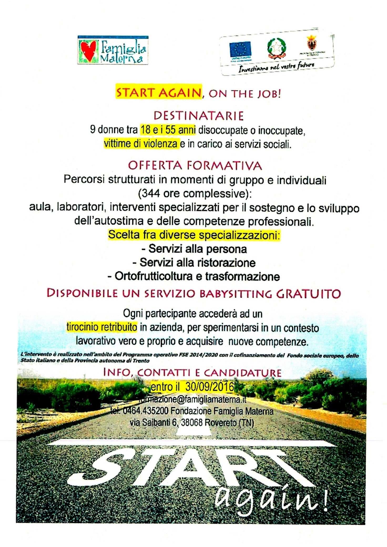 OBIETTIVO: offrire alle donne vittime o potenzialmente vittime di violenza un corso utile all’acquisizione di strumenti utili per la definizione e la realizzazione di un progetto professionale nei campi dei servizi alla persona, servizi alla ristorazione o ortofrutticoltura e trasformazione